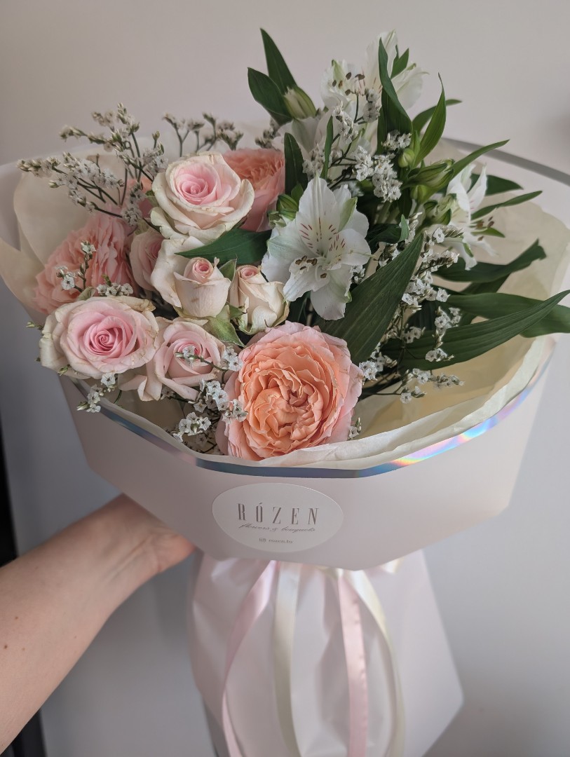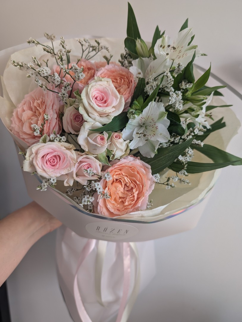 Роза кустовая пионовидная - 1 шт. Роза кустовая - 2 шт. Альстромерия - 1 шт. Лимониум - 1 шт. Упаковка