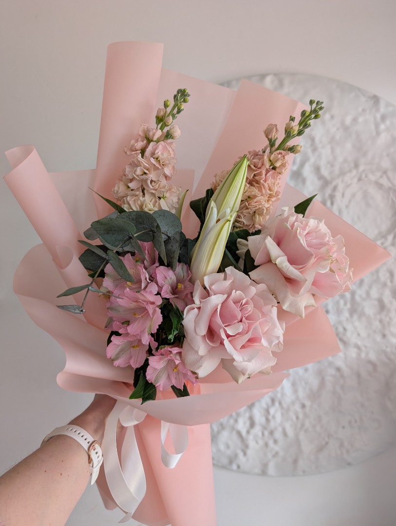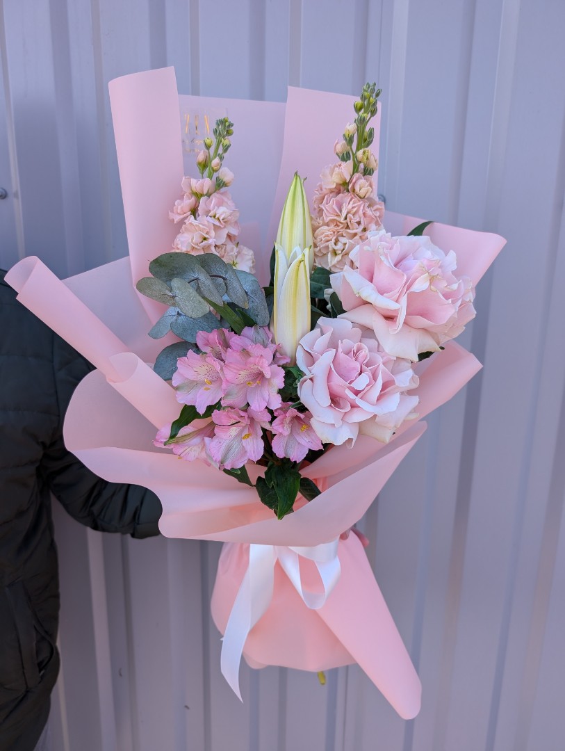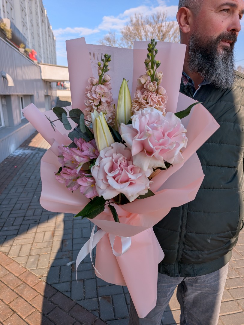 Лилия-1 шт. Роза французская 2 шт. Маттиола - 2 шт. Альстромерия - 1 шт Эвкалипт - 2 ветки. Упаковка