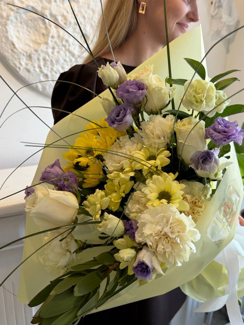 Леукодендрон - 1 шт. Роза одноголовая - 3 шт. Хризантема кустовая - 2 шт. Диантус - 7 шт. Эустома - 3 шт. Рускус - 3 шт. Зелень писташ пучек - 1 шт. Берграс пучек-1 шт. Упаковка - 1шт Лента - 1 шт.