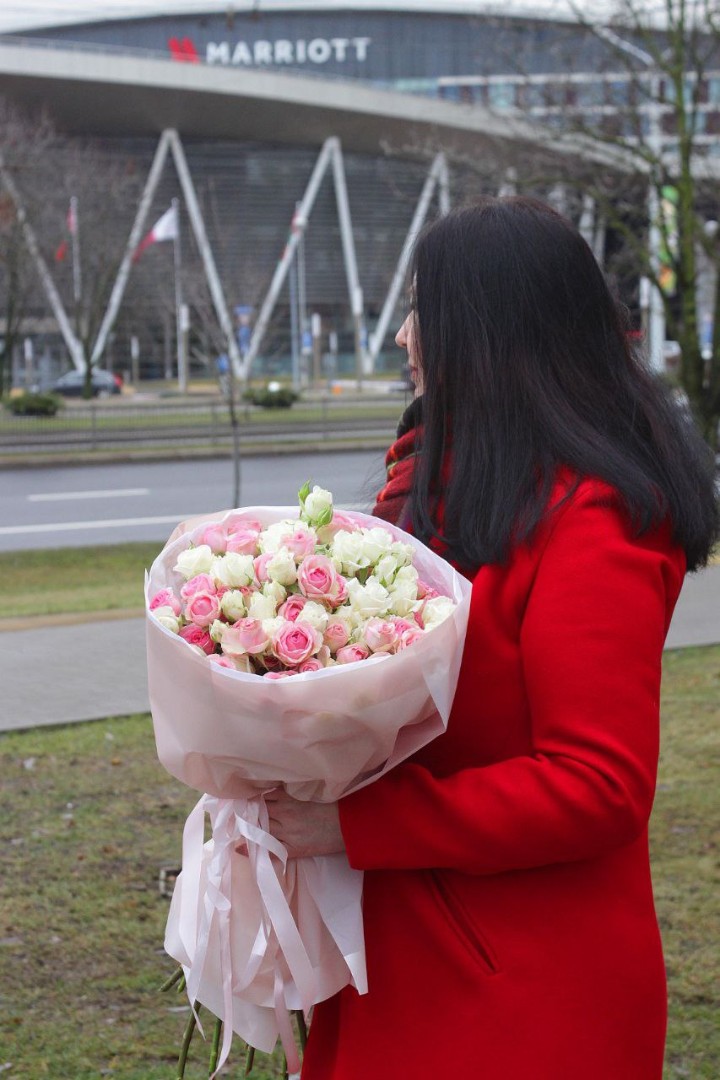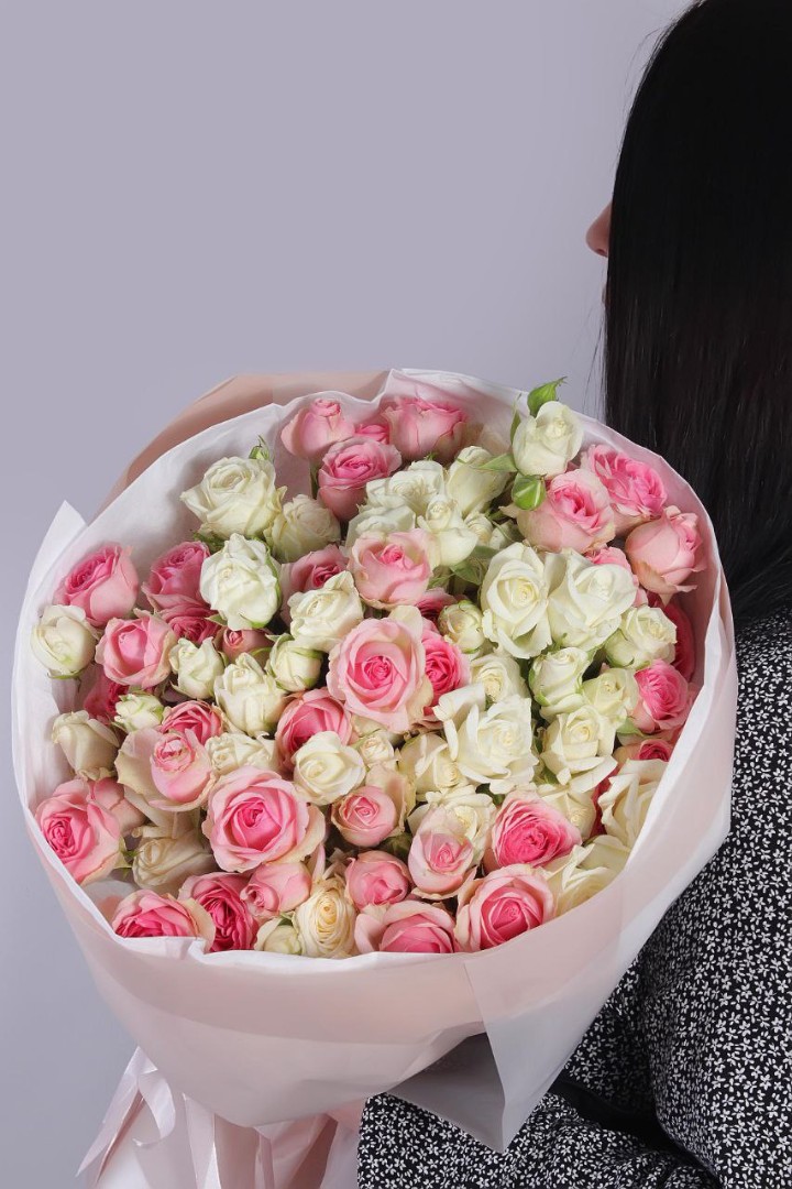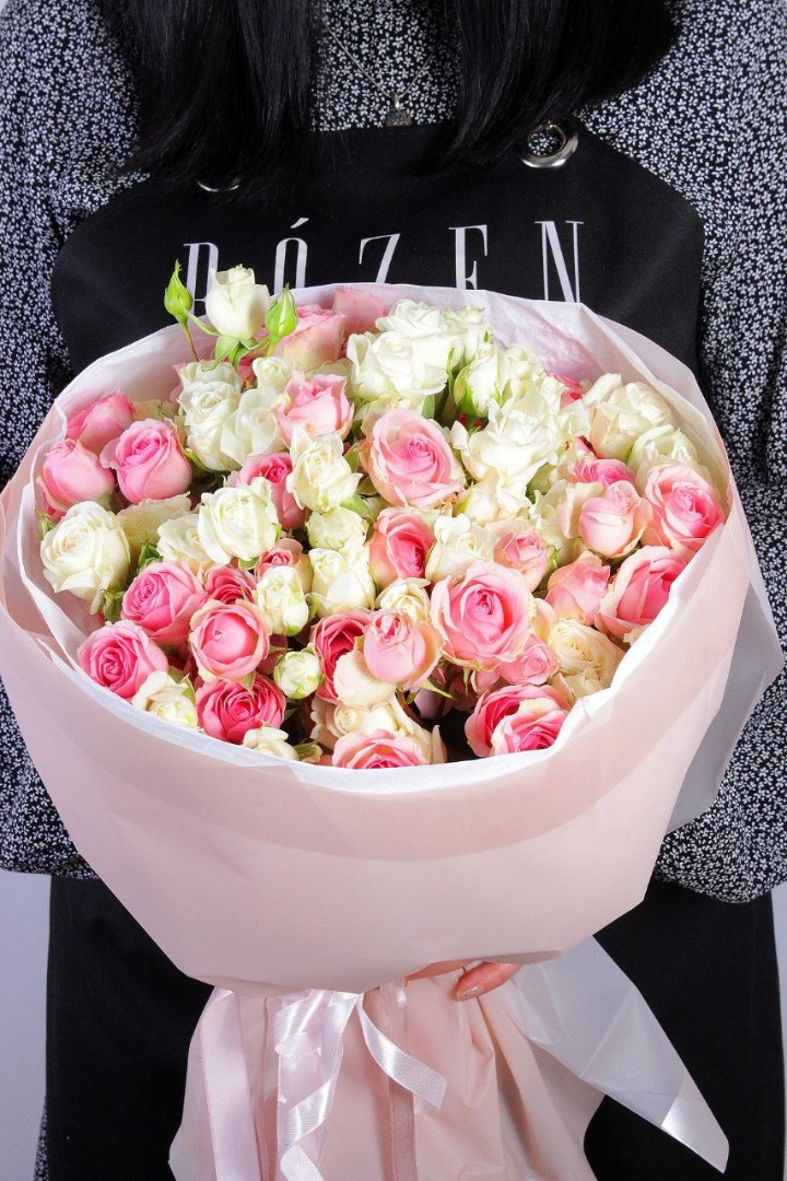Розы кустовые пионовидные - 5 шт. Розы кустовые - 8 шт. Упаковка -1 шт.