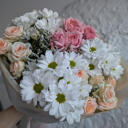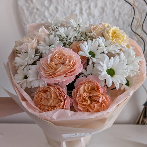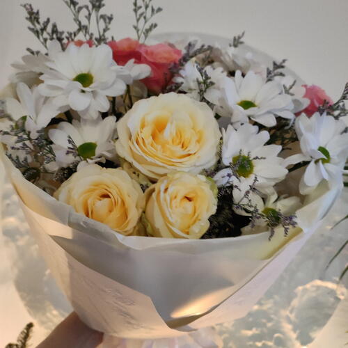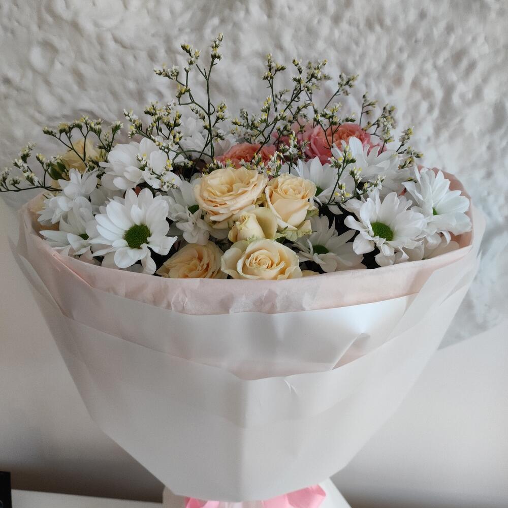 Лента - 1 шт. Лимониум - 1 шт. Роза кустовая - 2 шт. Хризантема кустовая - 3 шт. Тишью - 4 шт. Роза кустовая пионовидная - 1 шт. Упаковка дизайнерская - 1 шт.