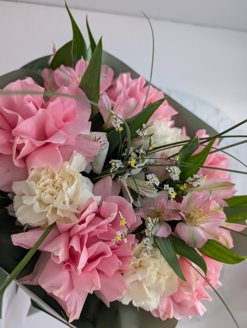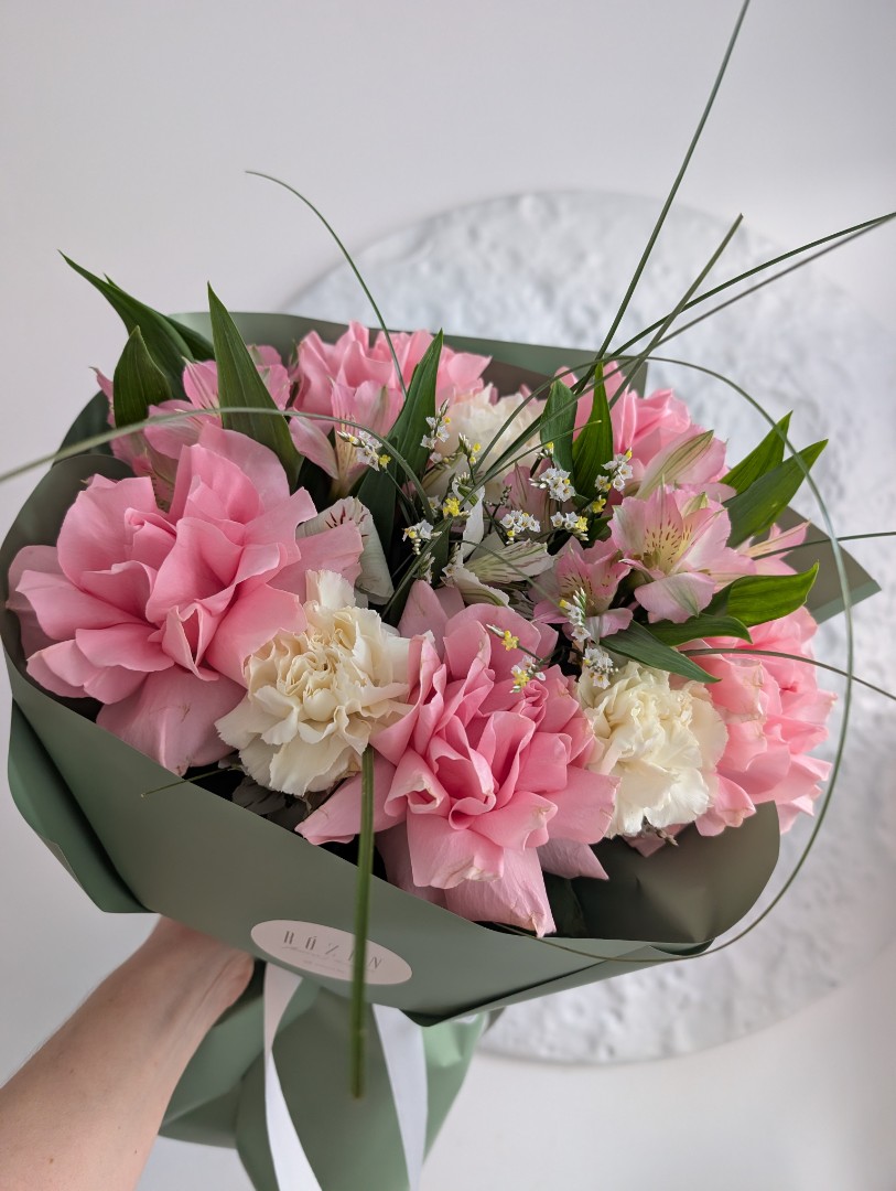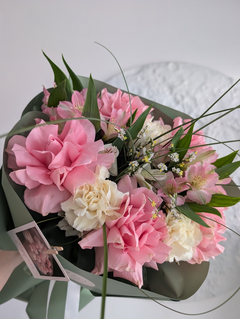 Роза французская- 5 шт Альстромерия - 3 шт Диантус- 3 шт Лимониум- 1 шт Берграс пучек Упаковка