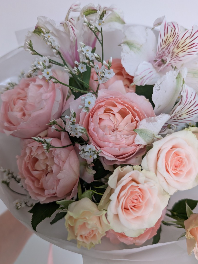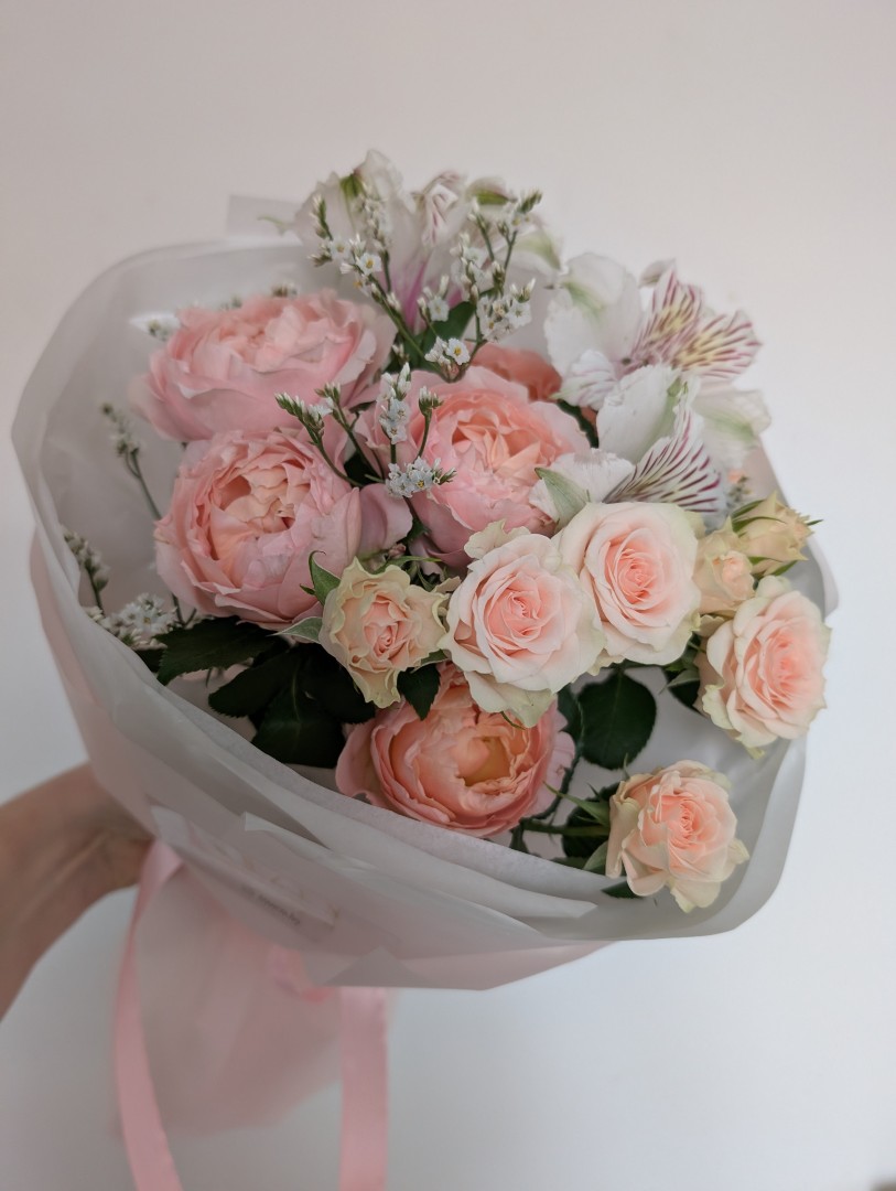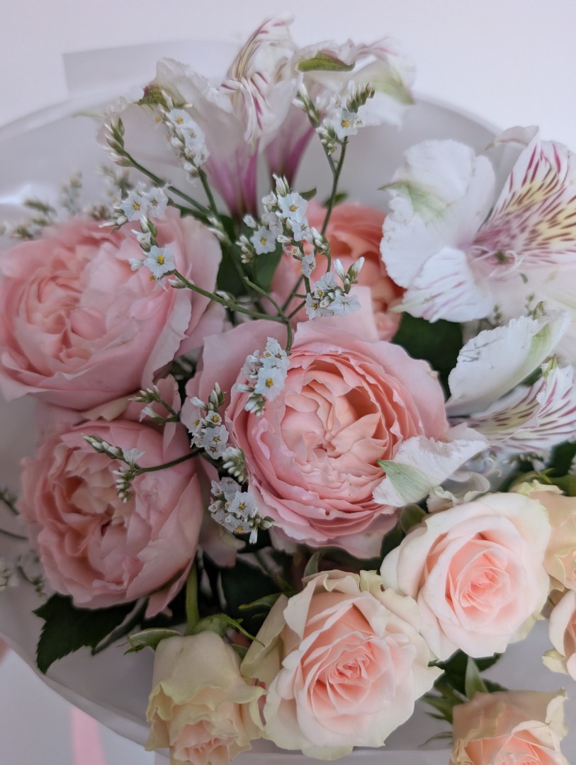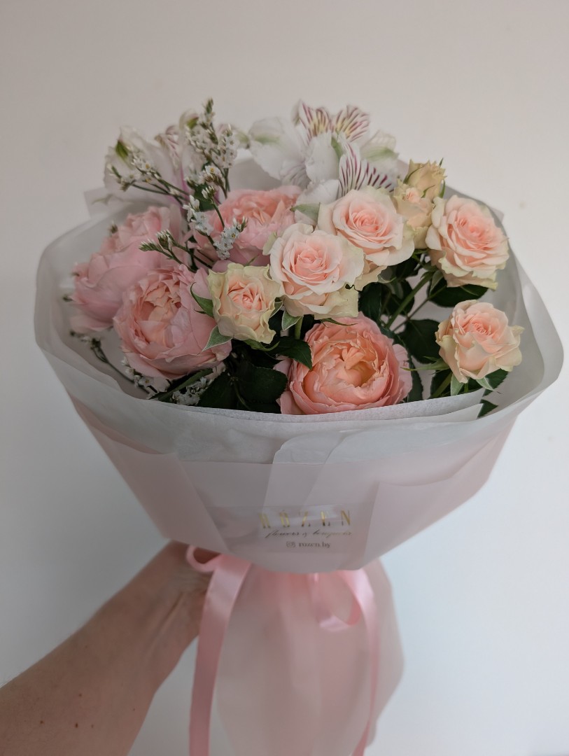 Роза кустовая пионовидная - 1 шт. Розы кустовые - 1 шт Альстромерия - 1 шт. Лимониум-1шт. Упаковка -1 шт
