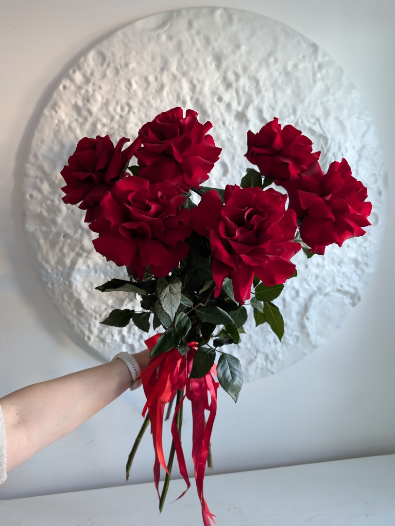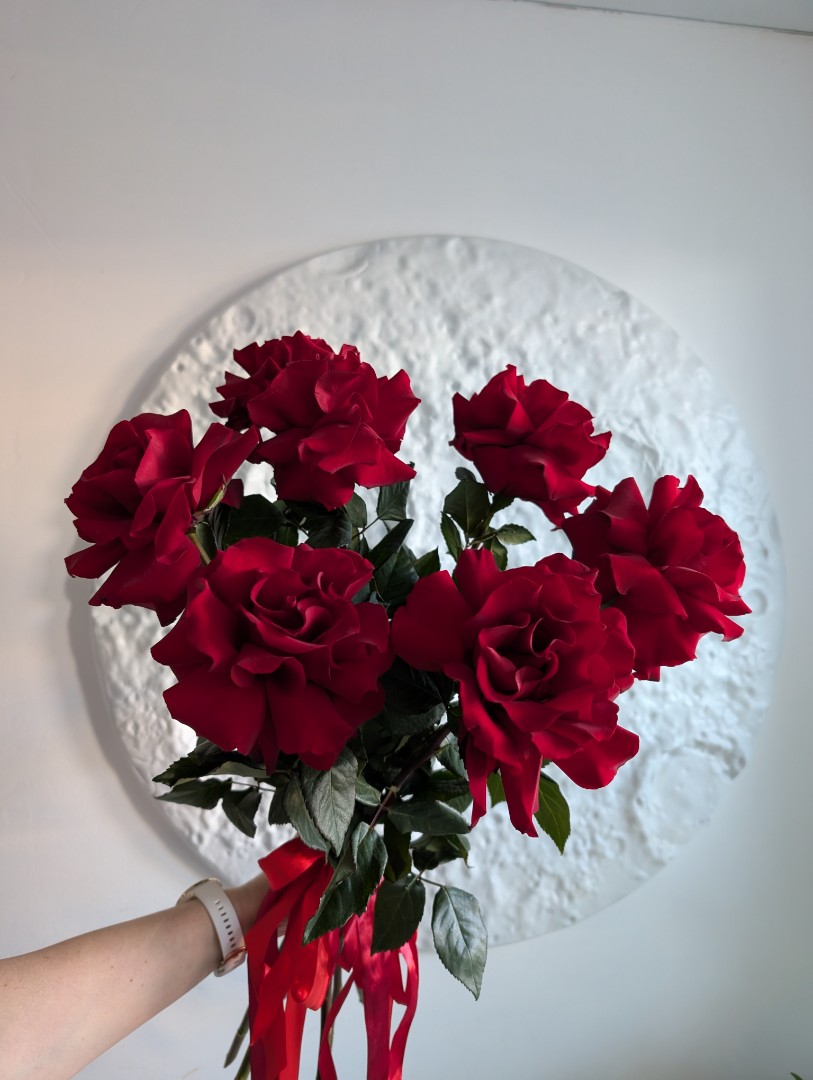 Розы французские красные -7 шт. Лента атласная - 3шт.