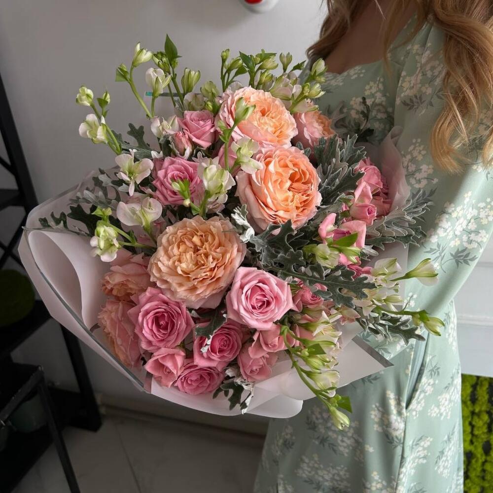 Розы кустовые пионовидные - 3 шт Розы кустовые - 2 шт. Альстромерия 4 шт. Упаковка
