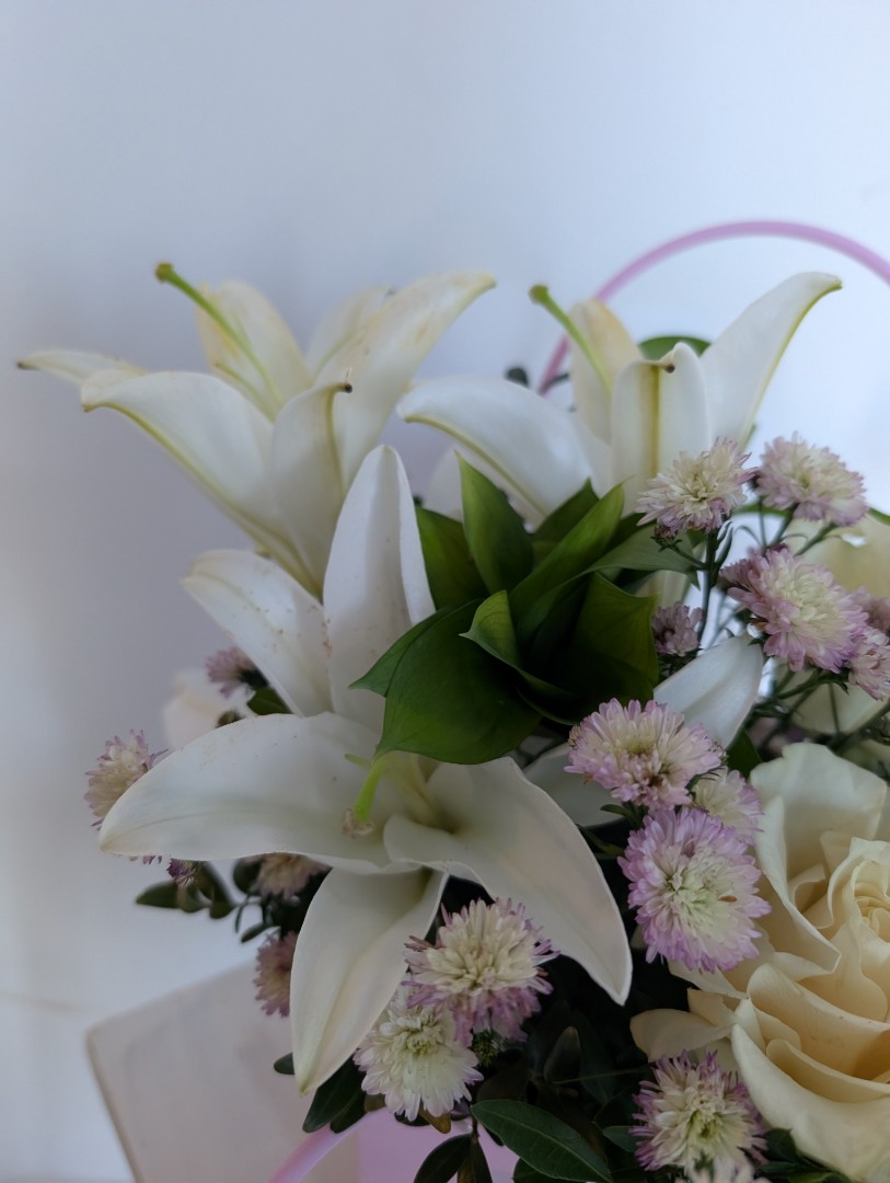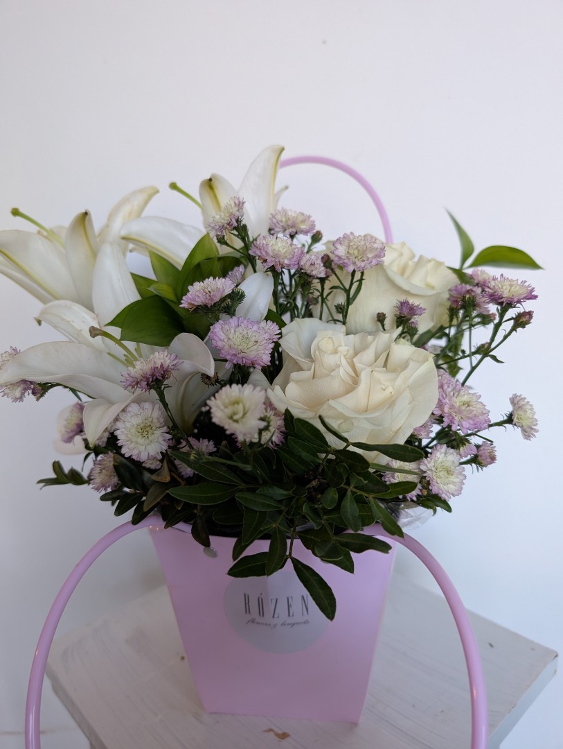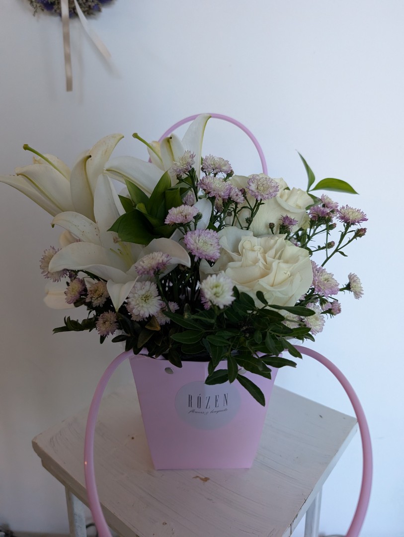 Лилия -1шт Роза одноголовая -2шт Хризантема кустовая- 2 шт Рускус -2 шт. Сумочка картонная- 1шт.