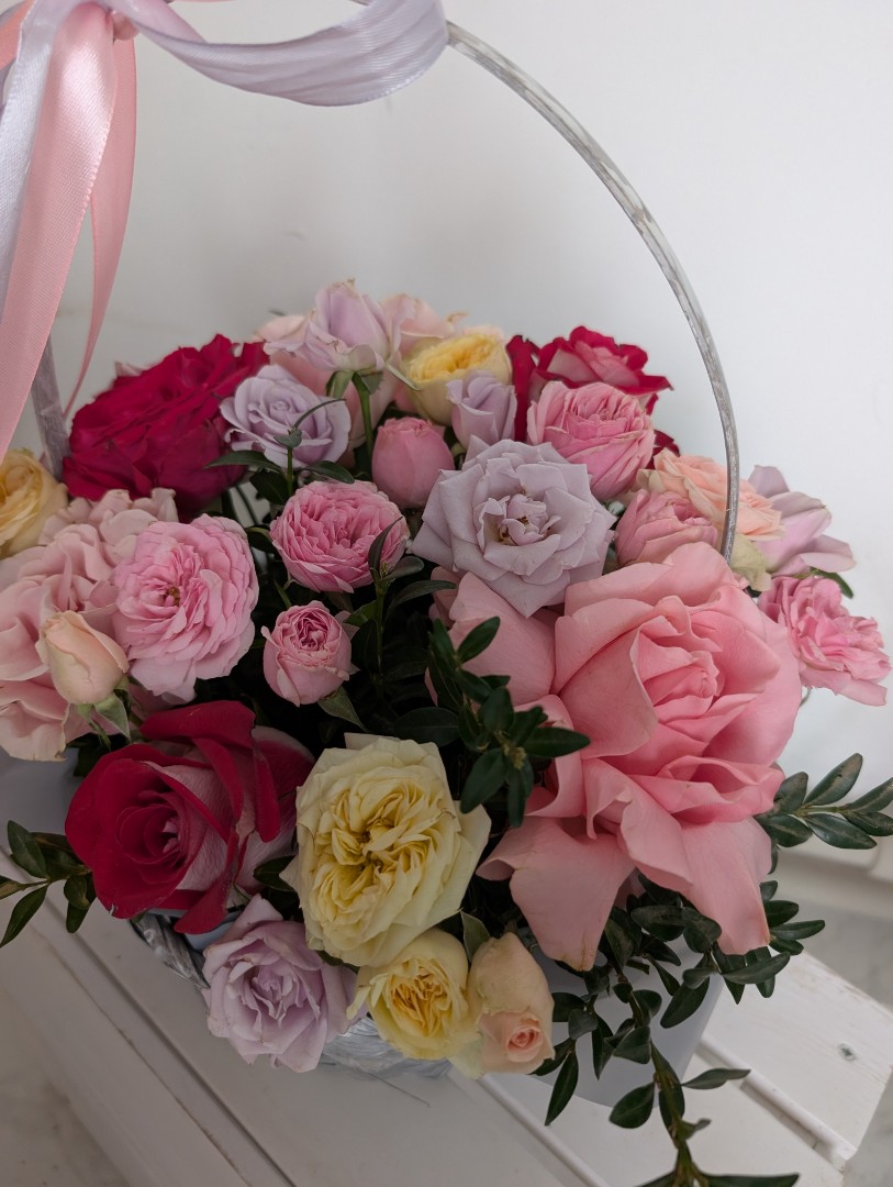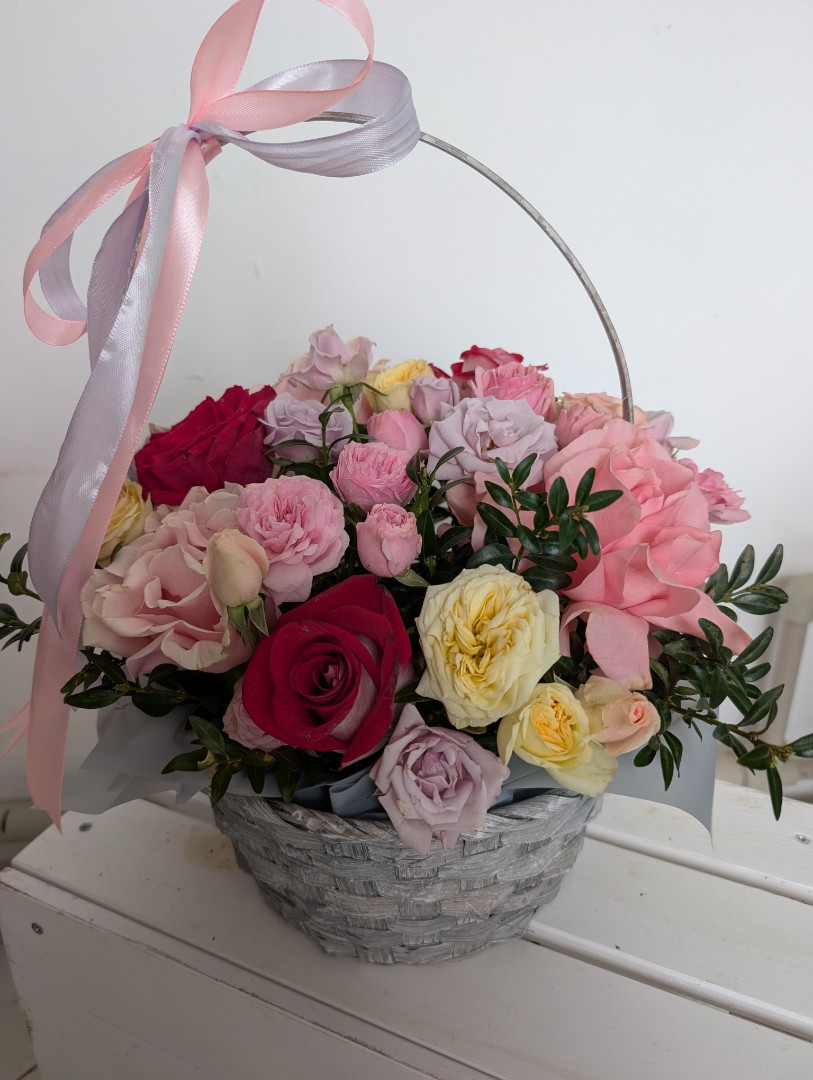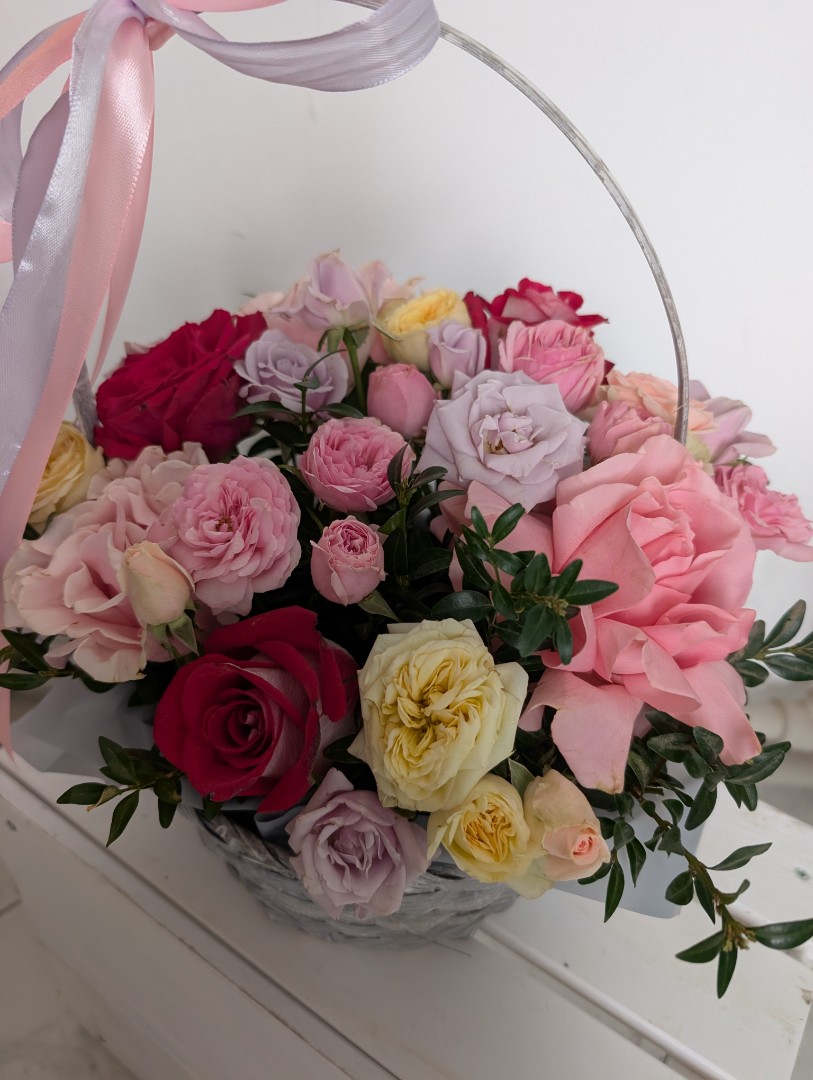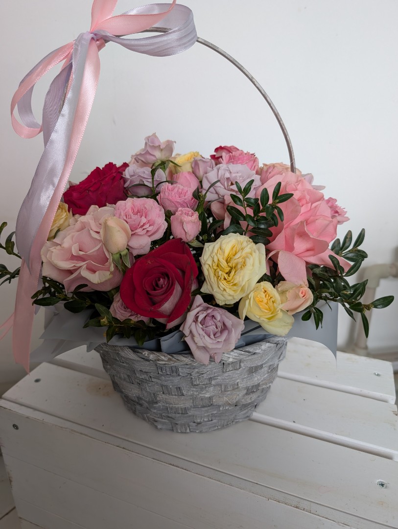 Розы кустовые - 3 шт. Розы одноголовые - 9 шт. Зелень декоративная Эвкалипт Корзина с оазисом