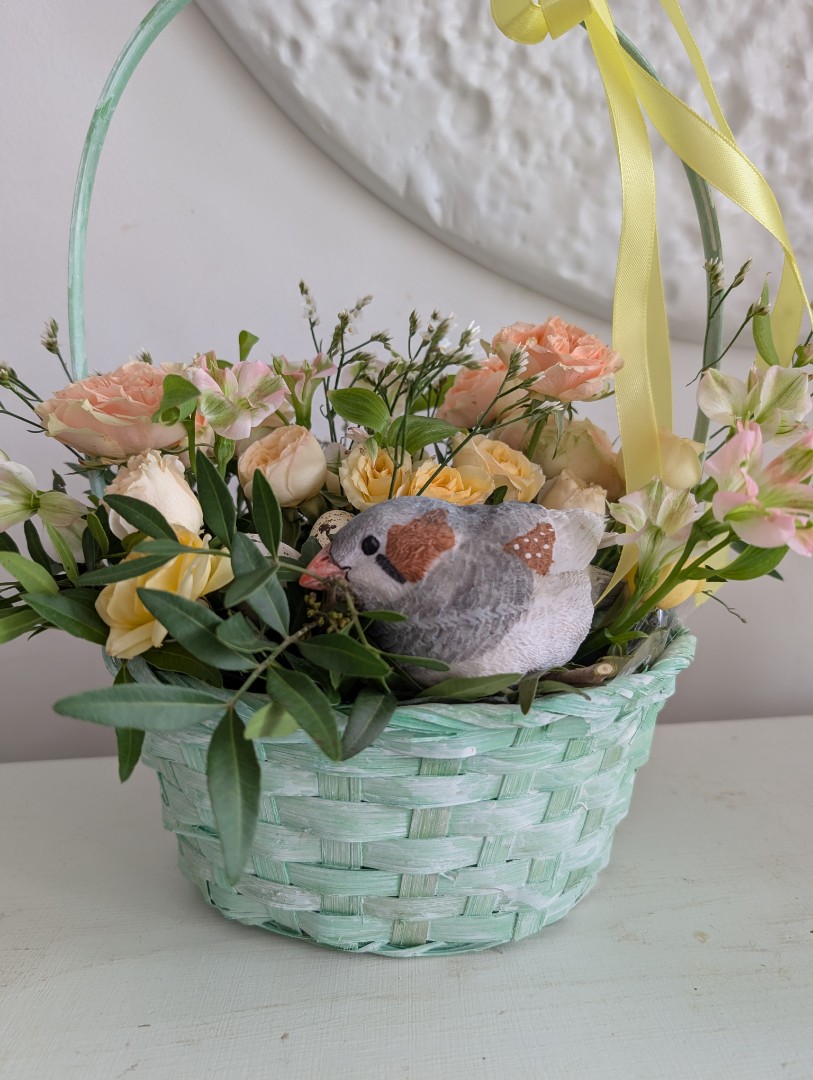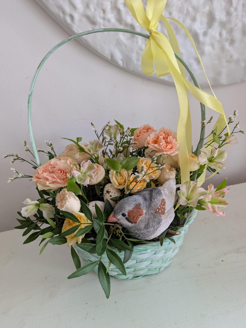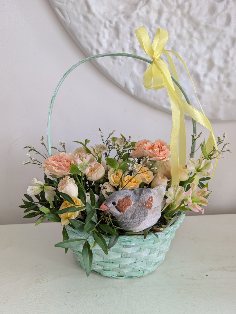 Корзинка плетеная - 1 шт. Декор птичка - 1 шт. Яйца декоративные - 2 шт. Розы кустовые - 4 шт Альстромерия - 2 шт.