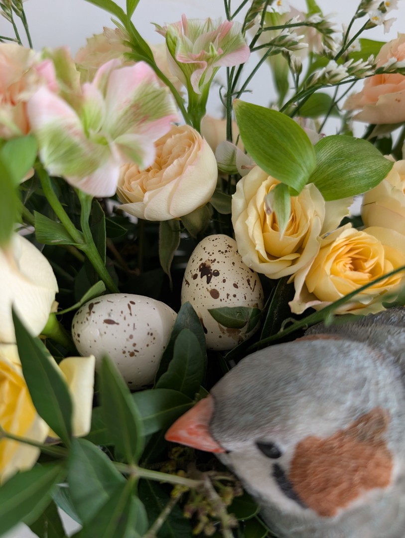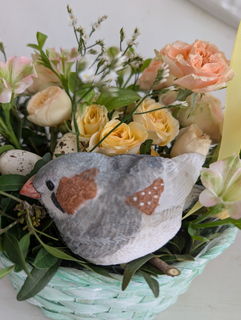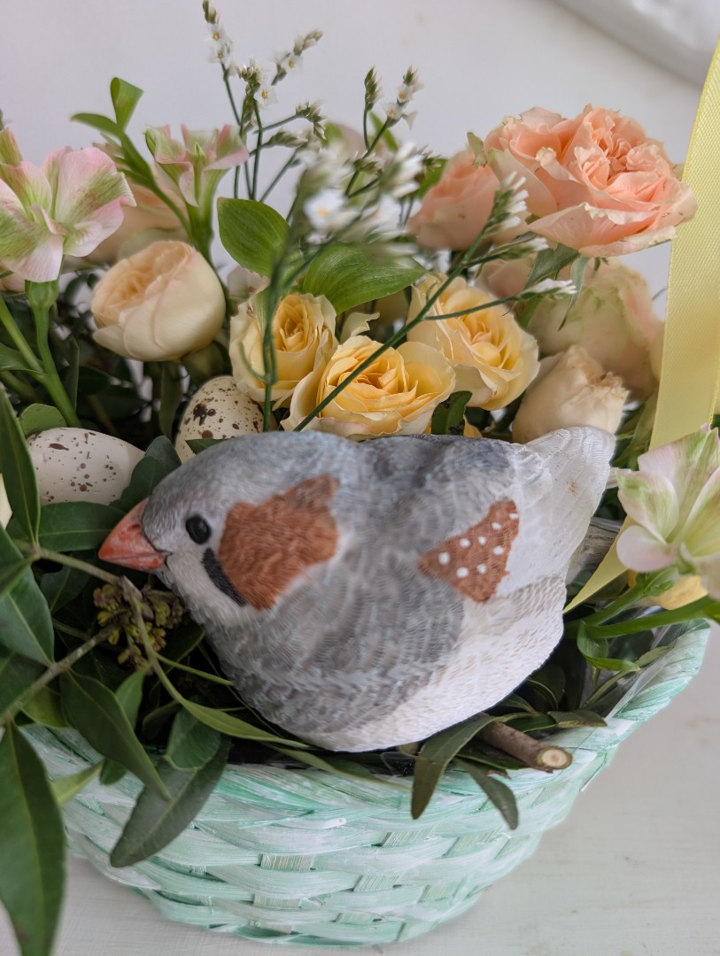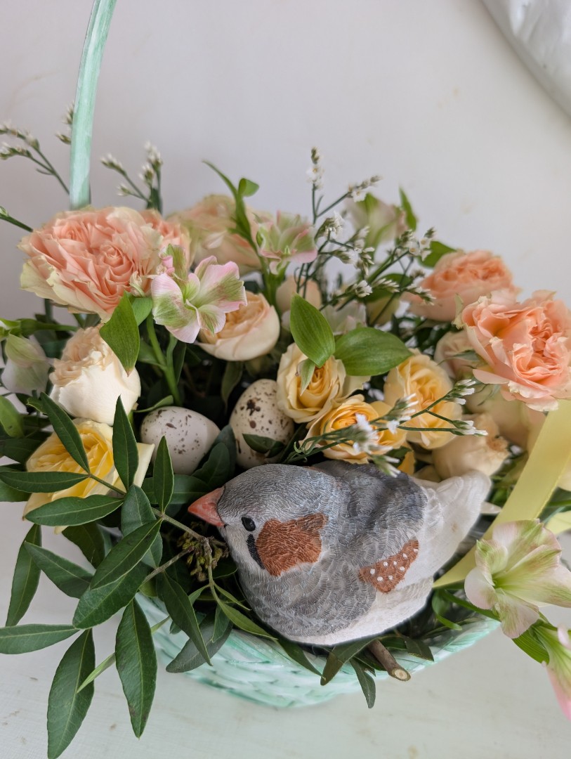 Корзинка плетеная - 1 шт. Декор птичка - 1 шт. Яйца декоративные - 2 шт. Розы кустовые - 4 шт Альстромерия - 2 шт.