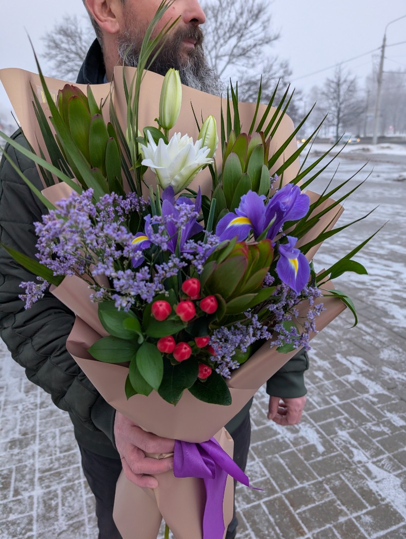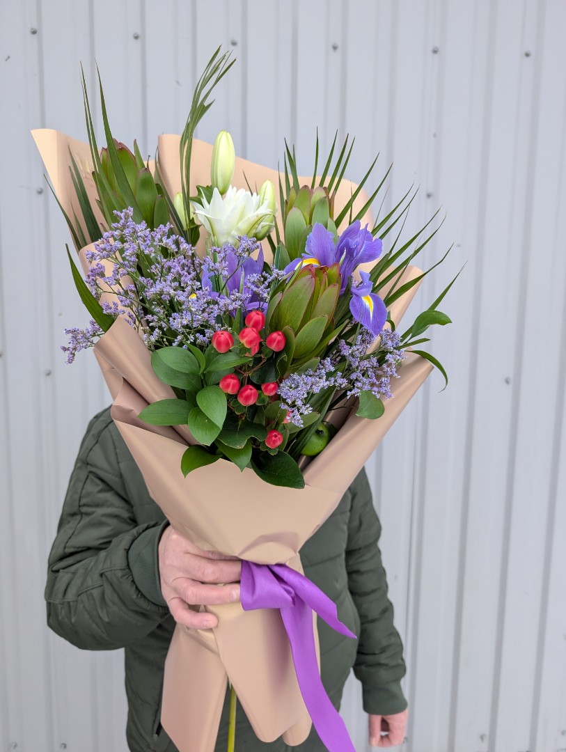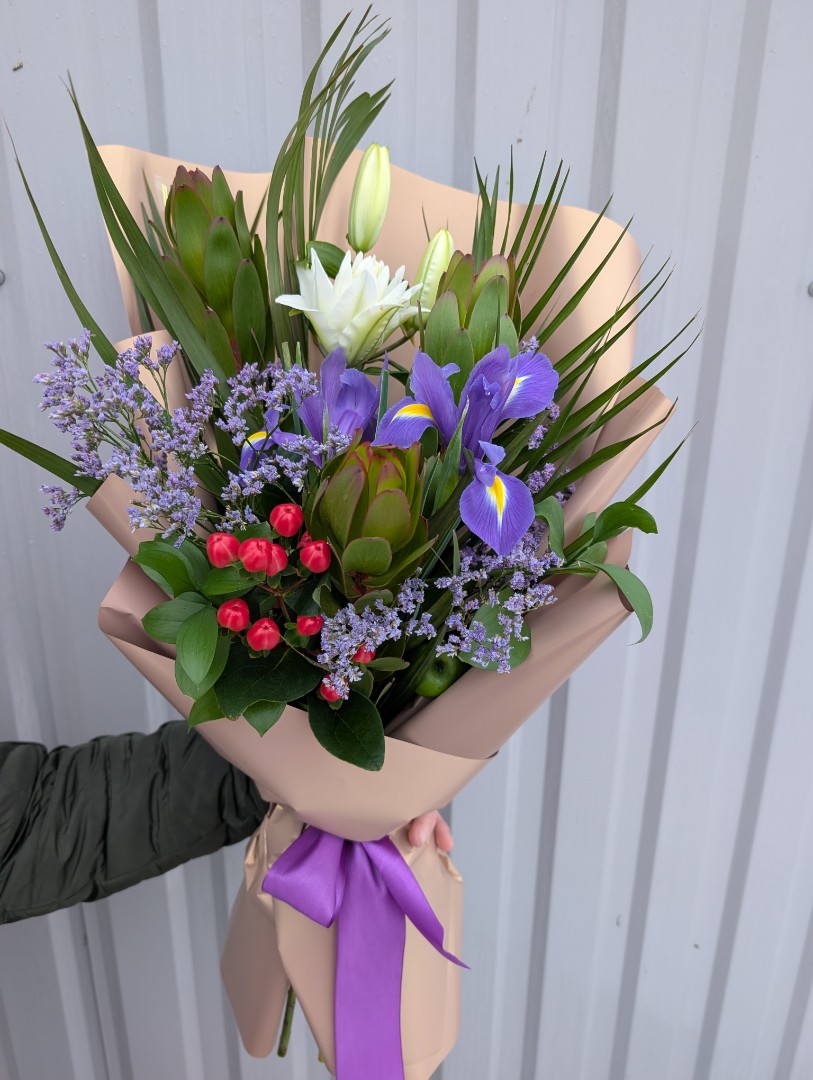 Лилии - 1 шт Леукодендрон - 3 шт. Ирис - 2 шт. Лимониум сиреневый - 1 шт. Зелень Чико - 4 шт Гиперикум-1 шт. Рускус-2 шт. Декор зеленое яблоко - 1шт. Упаковка